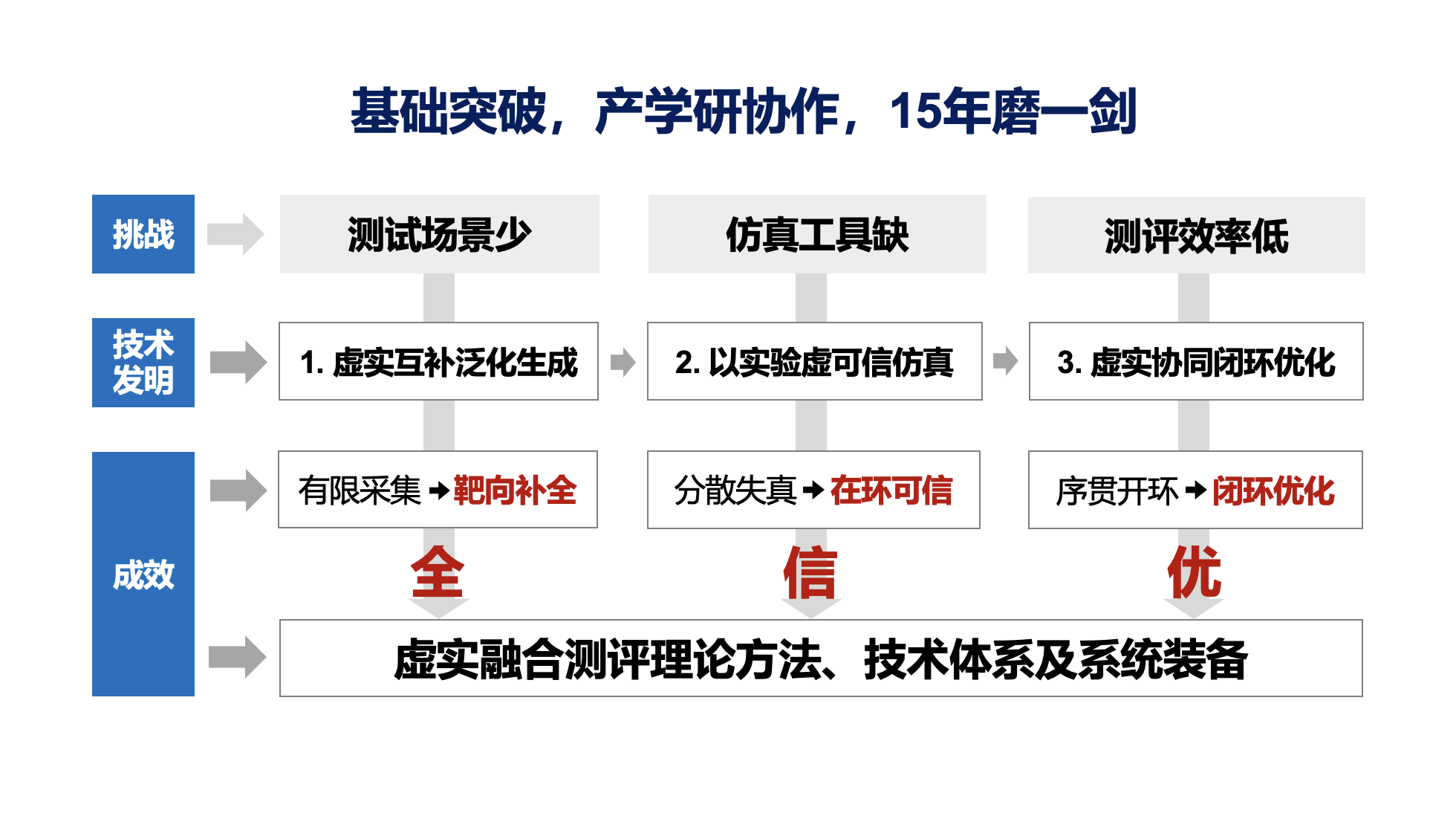 在技术创新方面,提出了虚实互补泛化生成、以实验虚可信仿真、虚实协同闭环优化三大关键测评技术,实现了测试场景从有限采集到靶向补全、测试工具从分散失真到在环可信、测试流程从序贯开环到闭环优化的三大突破,形成了虚实融合测评理论方法、技术体系及系统装备。