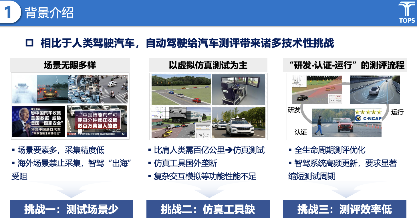 1) 自动驾驶系统需要应对开放交通的无限多样,但存在场景要素多,采集精度低,且海外场景禁止采集等的问题,需要解决现有测试场景少的挑战;