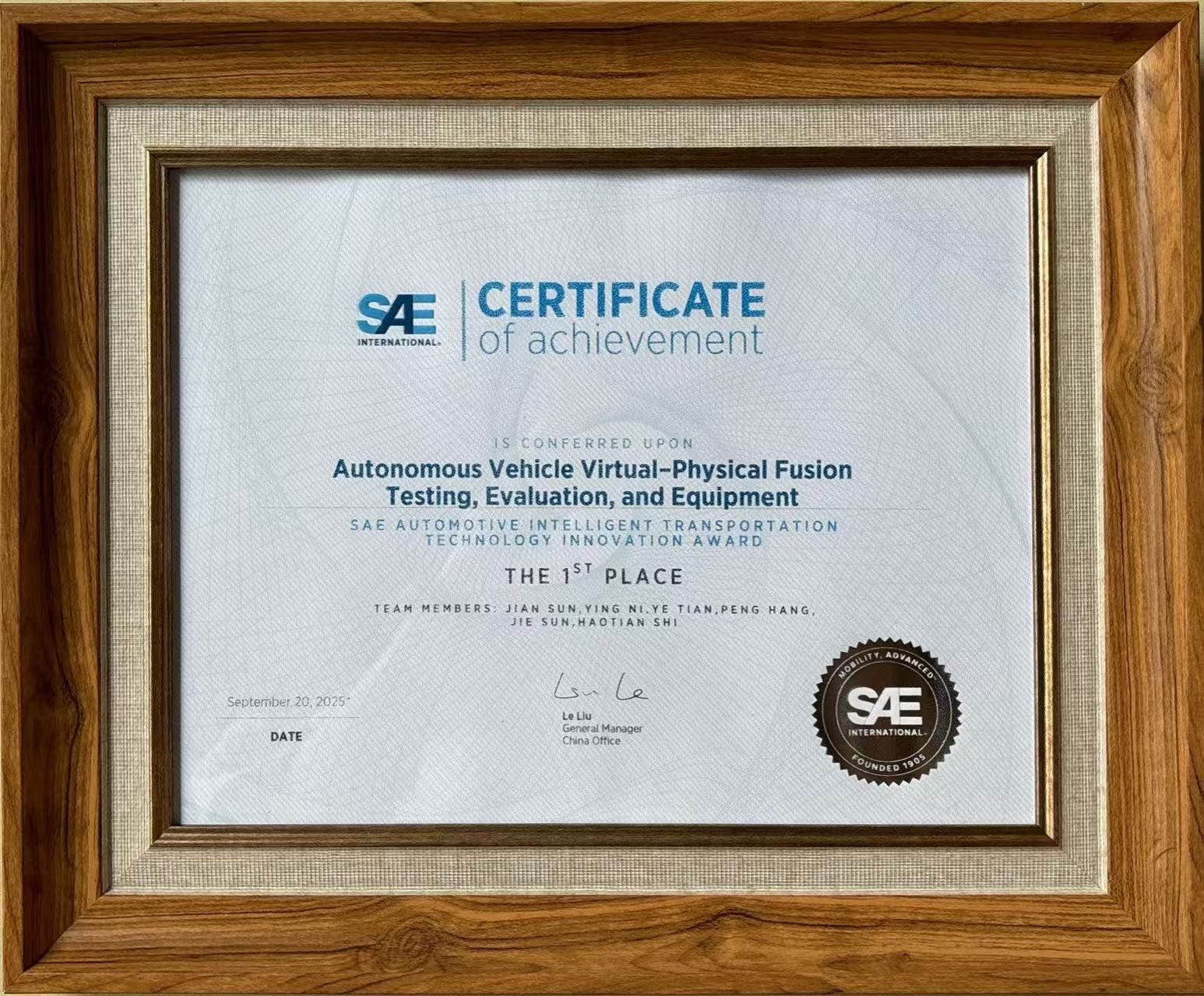 TOPS课题组孙剑教授研究团队研究成果《自动驾驶汽车虚实融合测评技术与系列装备》获SAE汽车智能交通技术创新奖一等奖(唯一)。