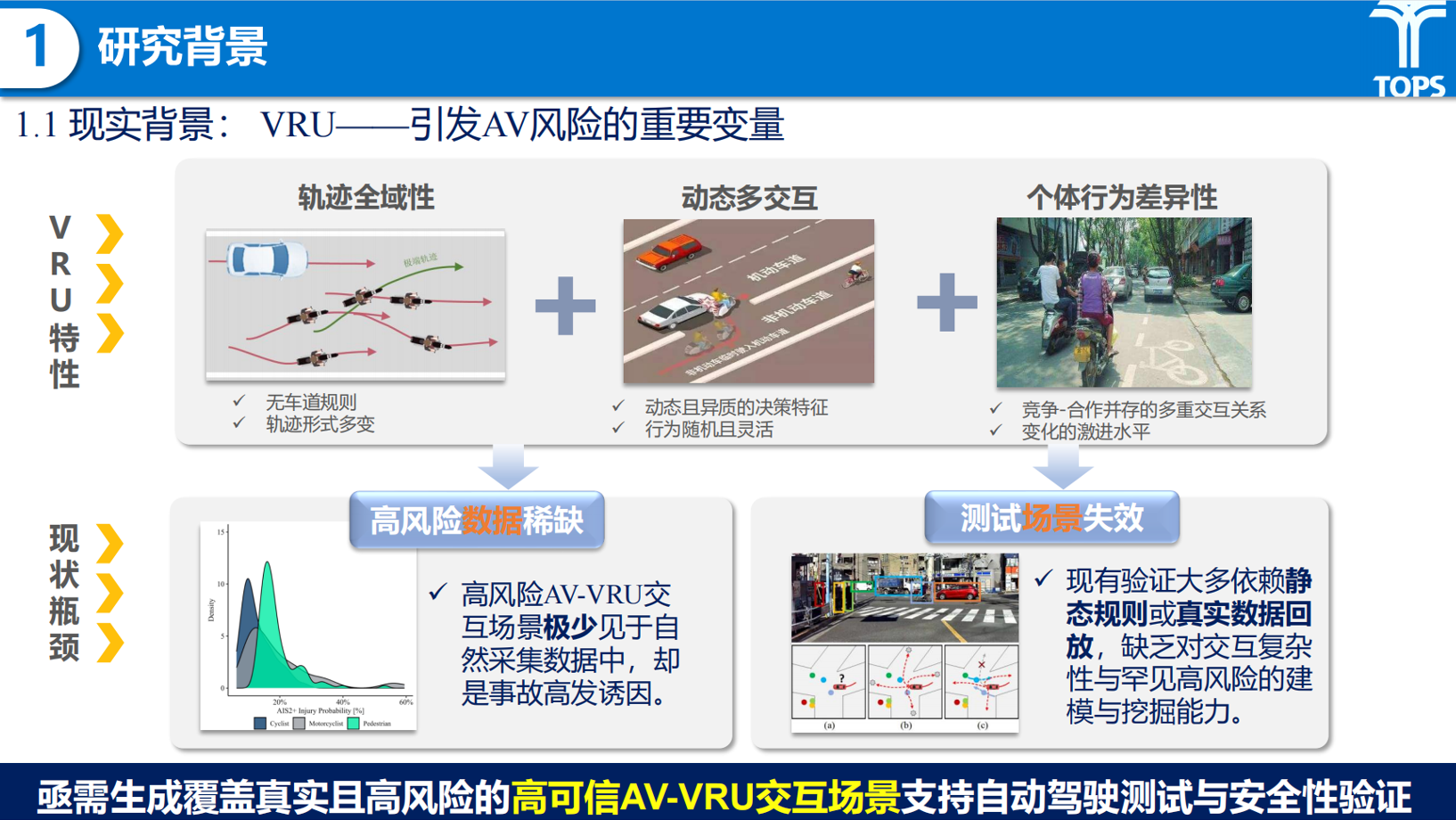 赵宇家指出,当前城市道路测试中AV–VRU交互事故频发,而自然采集数据中高风险样本稀缺、现有测试场景覆盖不足,亟需新的高可信场景生成方法。
