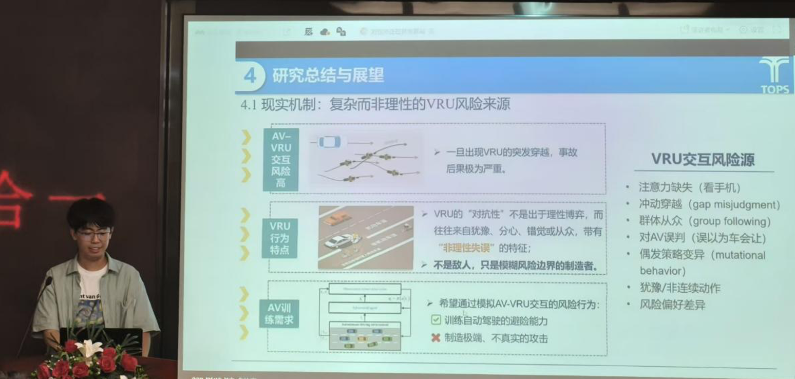 接着,24级硕士赵宇家聚焦于自动驾驶测试中AV(自动驾驶车辆)与VRU(弱势交通参与者)交互场景的高风险建模问题展开自己的研究介绍。