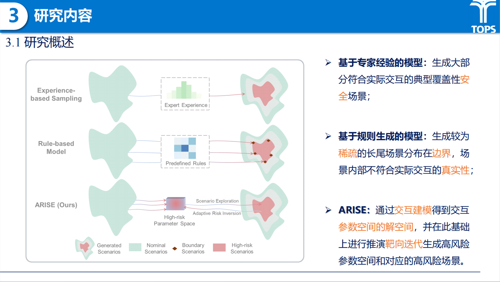 在此基础上,报告进一步提出了ARISE高风险场景生成框架。该框架通过启发式行为建模与参数空间推演,结合LightGBM风险识别与DBSCAN聚类算法,实现了从单参数到多参数组合的高风险区间识别与反向推演。生成的测试场景在真实性指标(JS散度<0.05)与轨迹精度指标(ADE=0.78m, FDE=1.53m)上均显著优于传统模型,能够高保真地重现真实交通中的复杂交互。