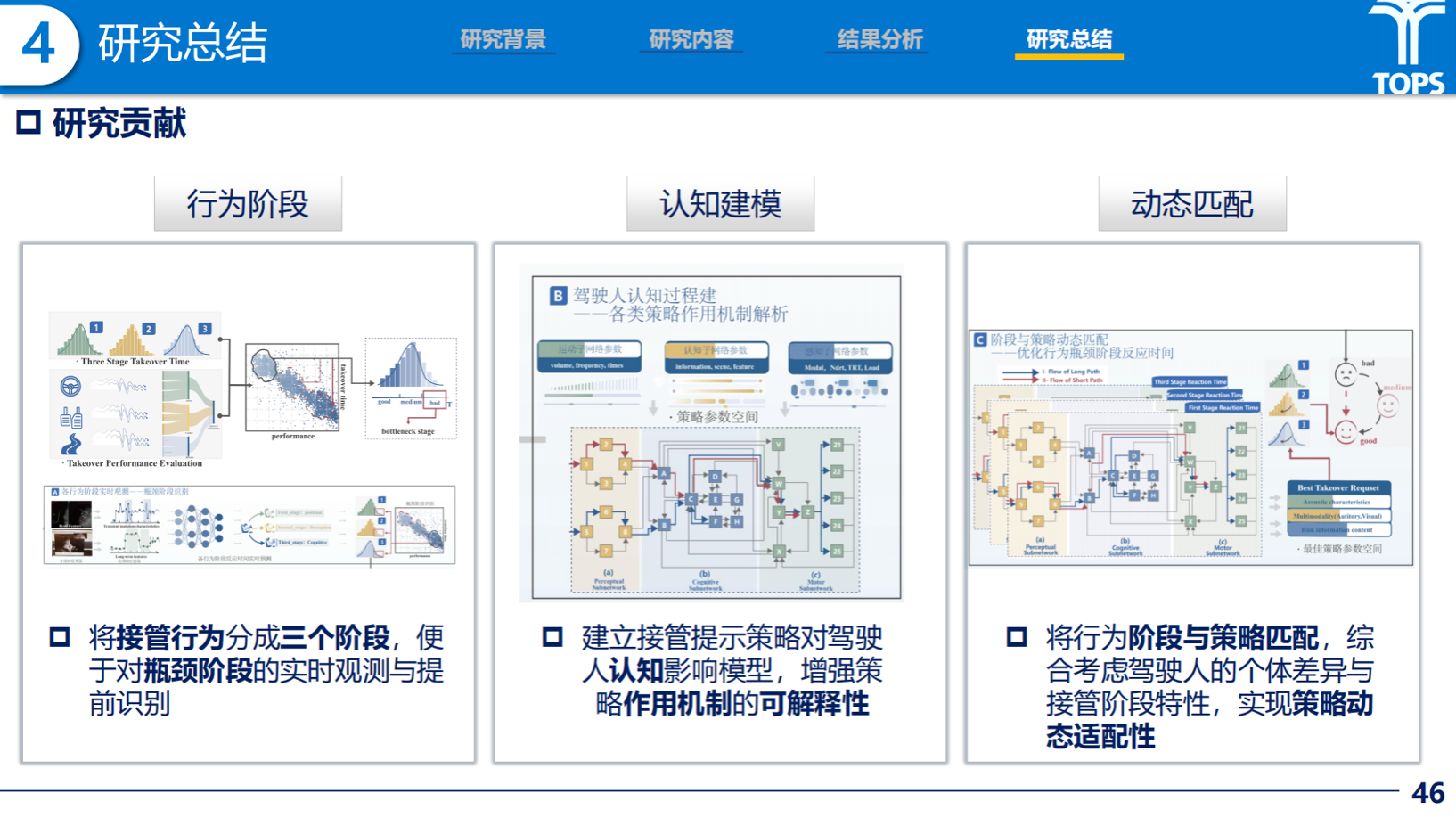在实验层面,王洁建立了基于反应时间与接管绩效的联合评价体系,并利用高斯混合模型(GMM)识别驾驶人接管中的瓶颈阶段。结果显示,结合声学、语义与视觉模态的动态提示策略,可显著缩短驾驶人反应时间并提升接管安全性。研究最终提出了“阶段-策略动态匹配”机制,为实现个性化接管提示和人因友好的自动驾驶人机交互提供了新的思路。