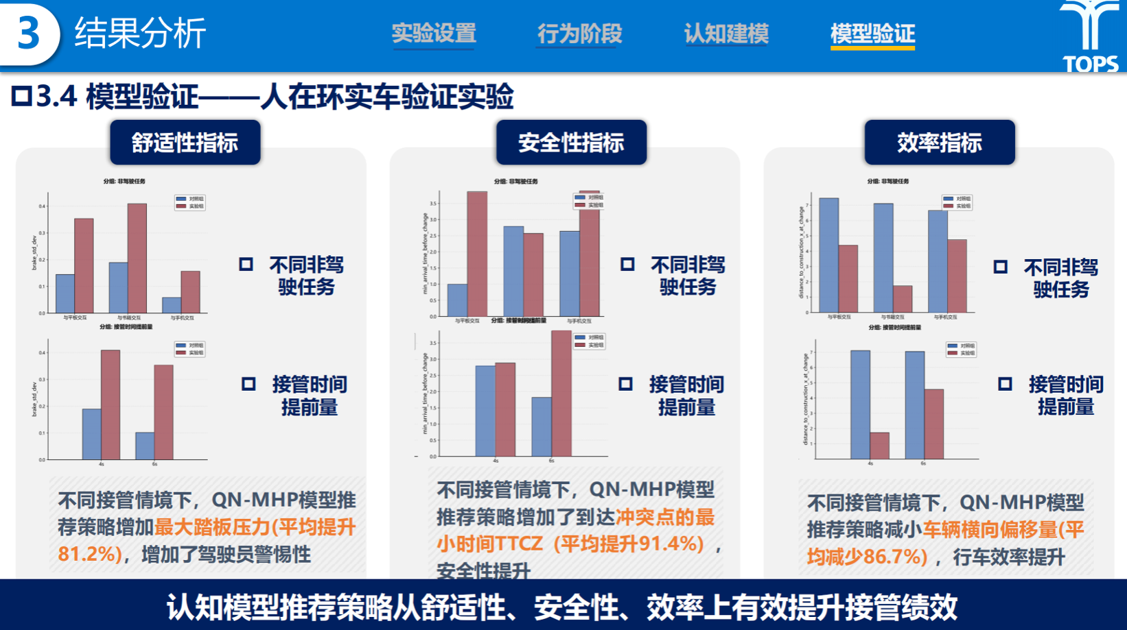 为解决这一难题,她提出了以驾驶人认知过程为核心的提示策略优化框架。研究将接管行为划分为体态恢复、感知恢复、认知恢复三个阶段,并基于多模态生理信号构建了可实时监测的认知状态模型。通过引入QN-MHP认知建模方法,实现了感知、认知与运动子网络的耦合建模,从而模拟驾驶人对提示信息的反应路径与时序特征。