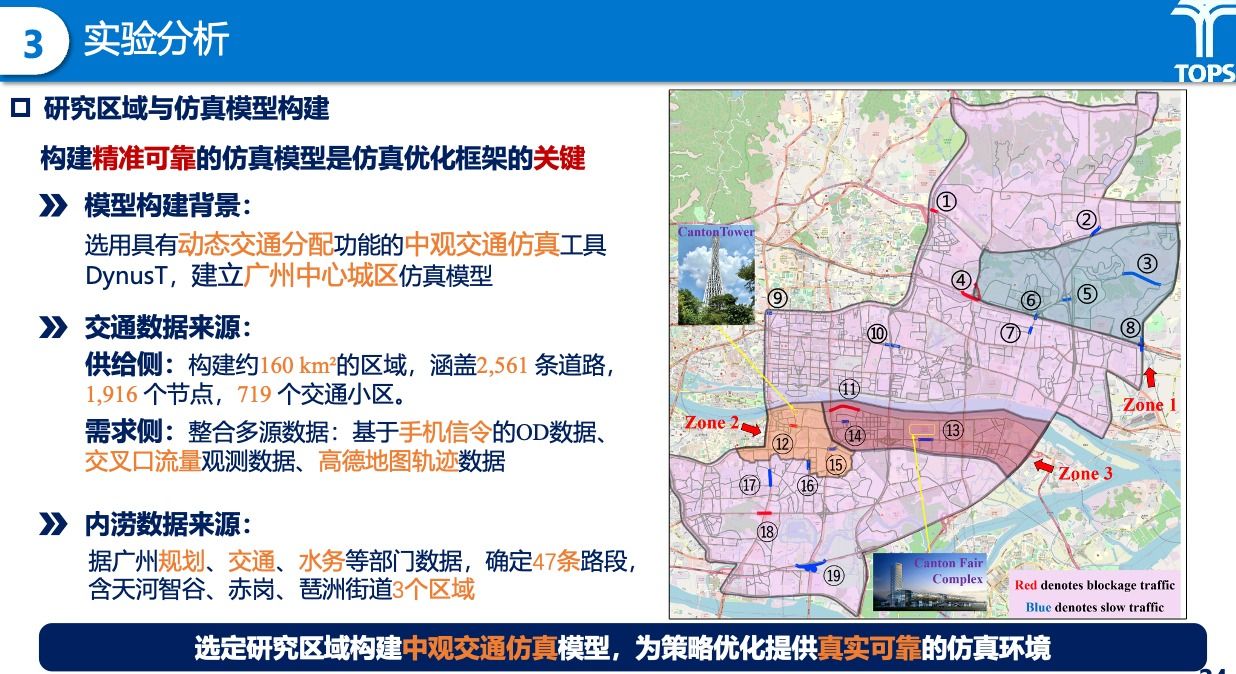 实验与分析方面,研究基于中观交通仿真工具DynusT,构建了广州市中心城区的中观交通仿真模型。基于此,研究对几种不同的建模策略的能力进行对比,结果表明多任务表示学习(MTRL)能提升模型性能,可获得更准确且稳定的预测结果。接着,朱玉寒通过分析基础任务共享机制(MTL)、任务感知机制(CBN)的适用性和有效性,证明了提出模块的优势。为评估MTRL-SBO方法的优化能力,研究设计资源受限下的内涝点位疏导实验,实验结果证明了该框架的精度与稳定性,验证了其在城市内涝治理中的应用价值。