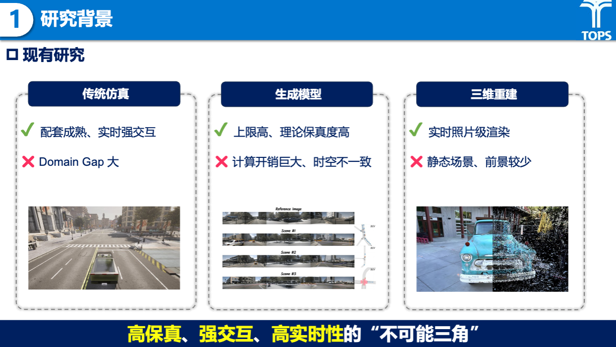 在研究背景方面,李思营指出现有场景生成的难点:传统仿真、生成模型和三维重建方法,同时面临着一个“不可能三角”,即同时做到高保真、强交互和高实时性。为解决当前研究的这一问题,他指出需要在保证视觉质量的前提下,对资产进行轻量化;此外,在视觉匹配方面,需要实时估算局部光照与阴影。