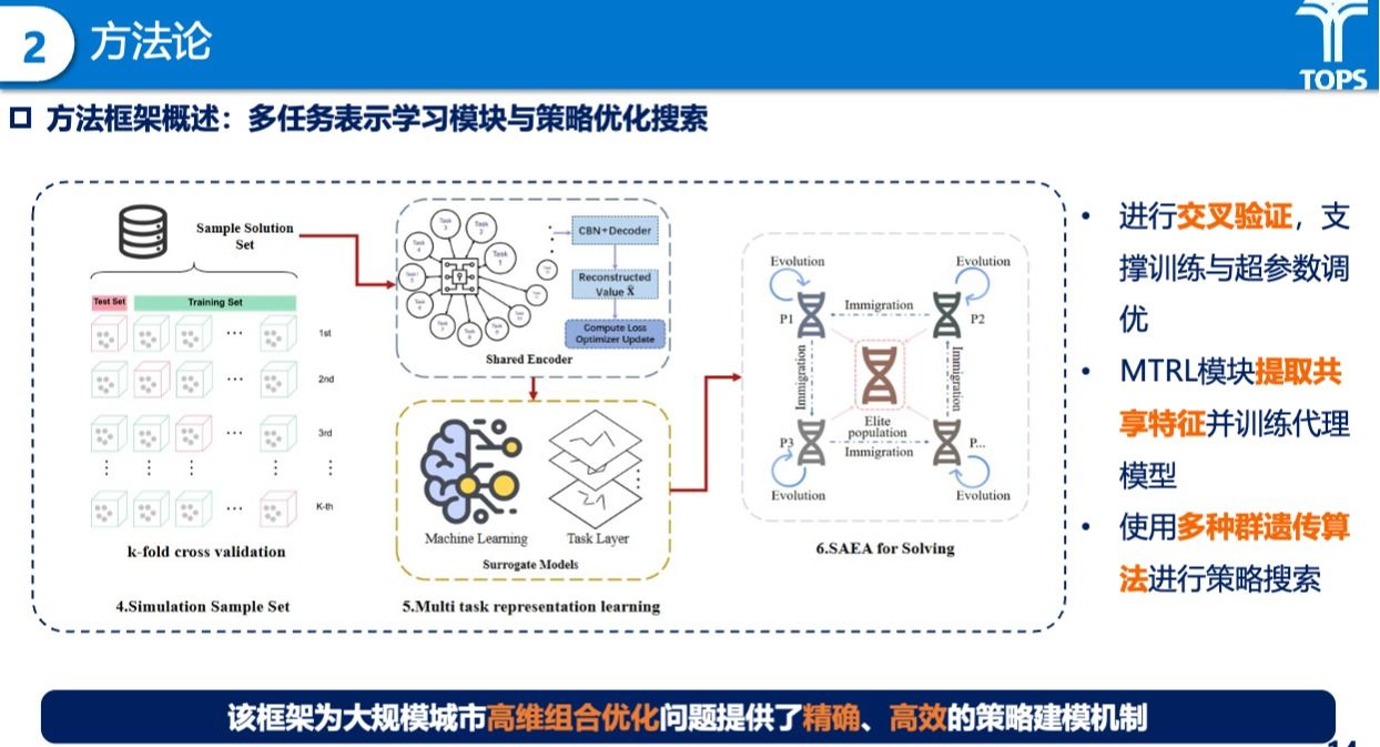 为解决当前的研究挑战,朱玉寒采用仿真优化(SBO)框架来弥补现有路径的关键不足。整体仿真优化框架可抽象为包含仿真模型在内的双层规划,将治理优化任务建模为资源约束组合优化问题。针对仿真优化框架难以求解多场景复杂任务的缺点,研究提出了多任务表示学习模块,为组合优化问题提供了精确、高效的策略建模机制。
