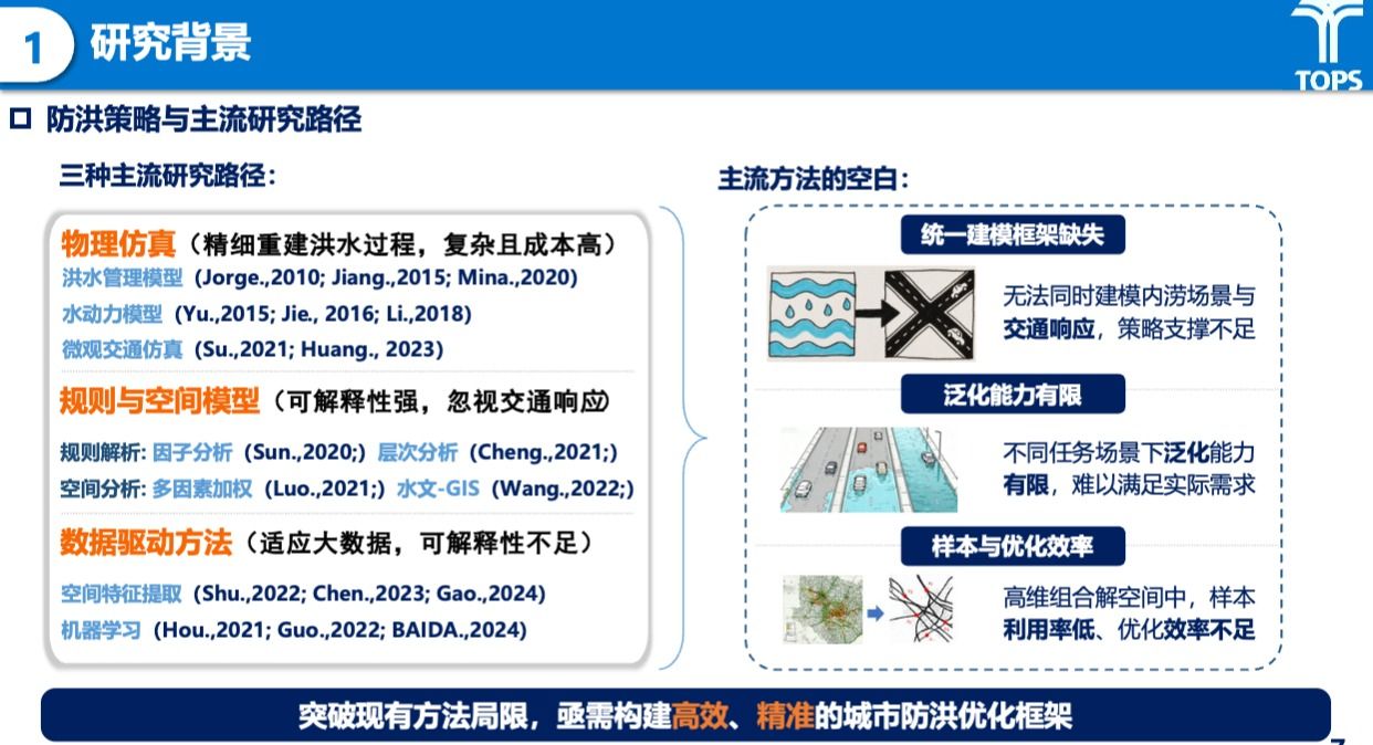 研究背景方面,朱玉寒指出,近些年极端城市洪涝事件发生频率和强度持续上升,但我国目前城市防洪抗灾能力严重不足。主流的研究路径包括物理仿真方法、规则与空间模型和数据驱动的方法,虽然这些方法论各具优势,但在应对复杂城市洪涝优化问题时存在明显缺陷。