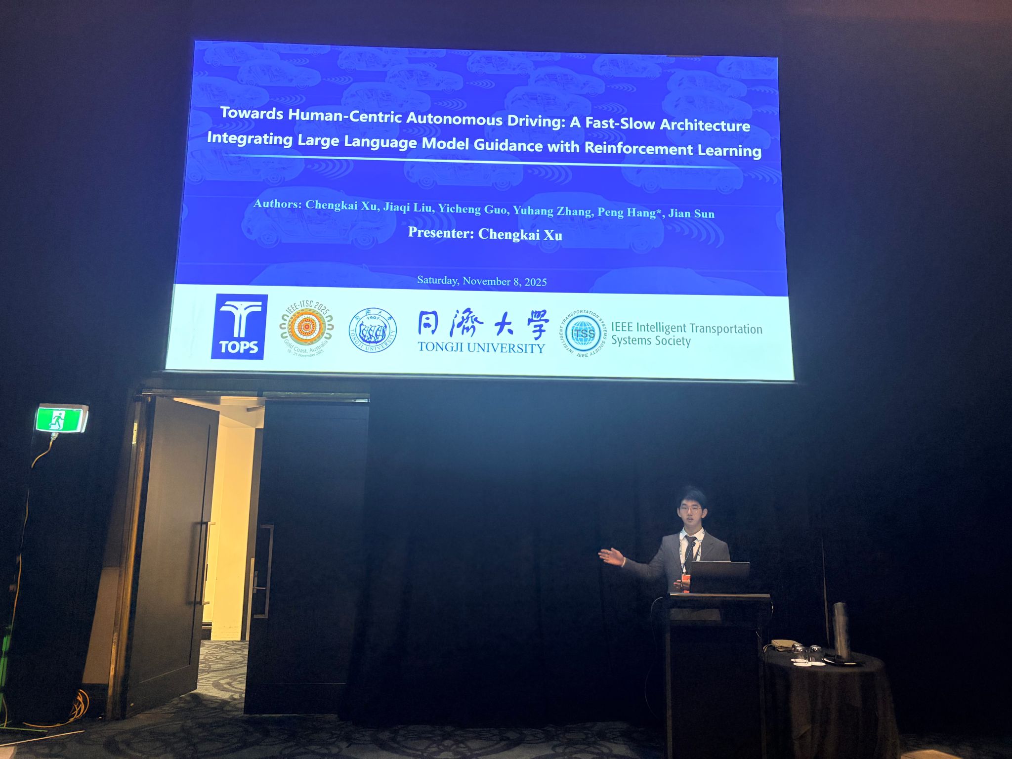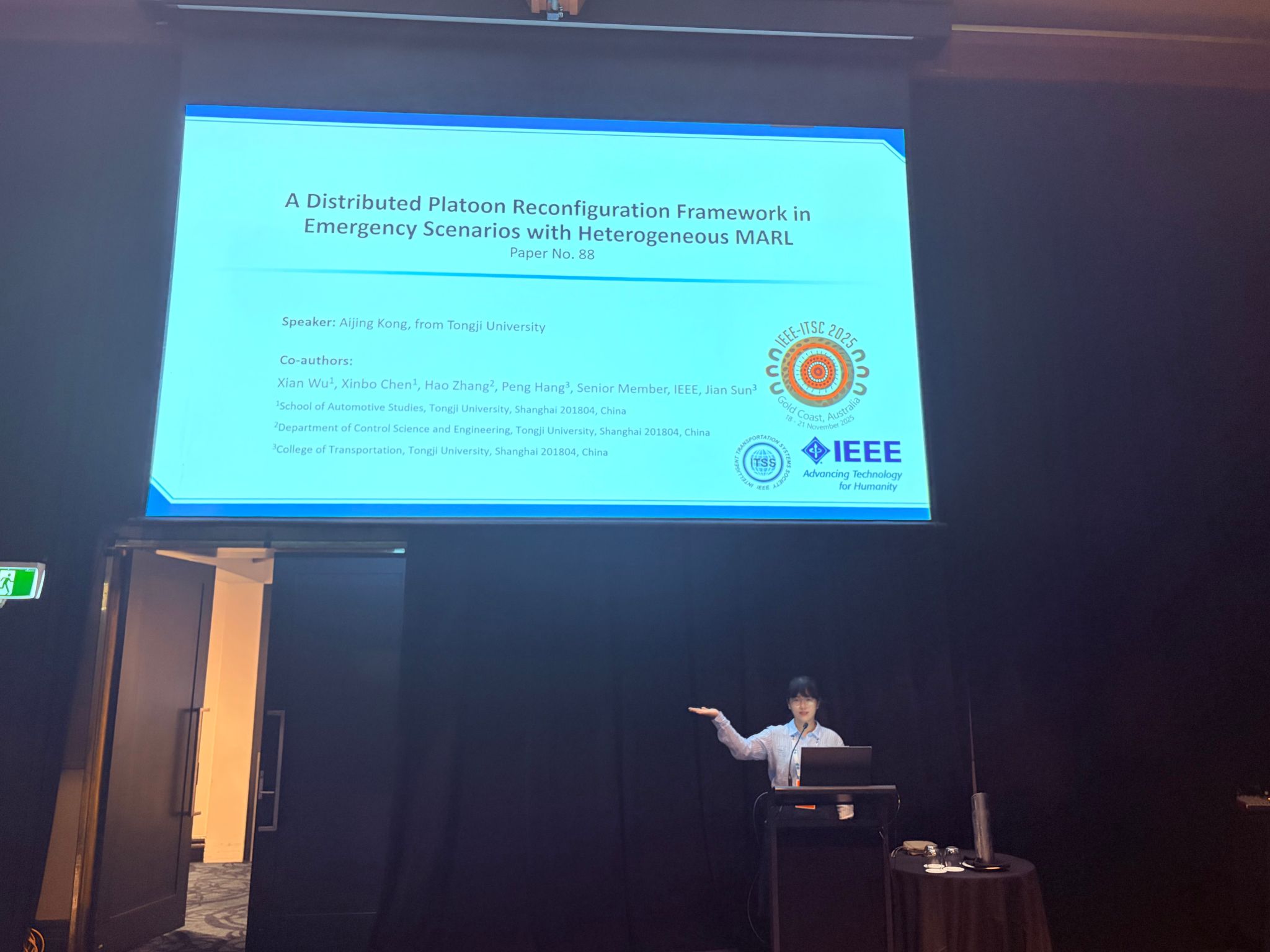 本次 ITSC 2025 会议期间,课题组成员通过口头报告、互动交流等形式,系统呈现了在智能车队协同控制、弱势交通参与者安全防护以及以人为本自动驾驶架构设计等方向的一系列最新研究成果。与会专家对课题组在将多智能体强化学习、大语言模型与自动驾驶技术深度融合方面的持续探索给予了积极评价。