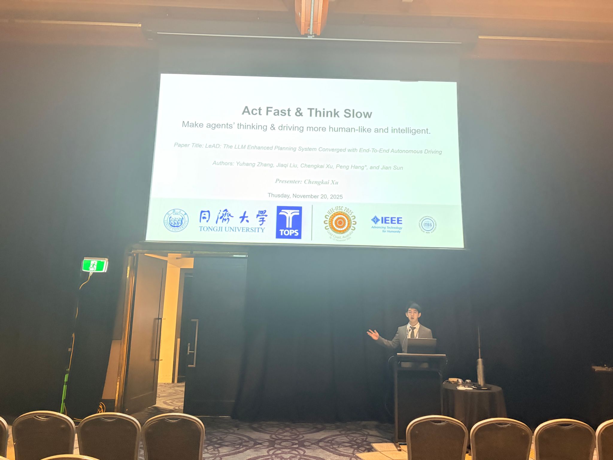 徐成凯则重点展示了课题组在基于 Foundation Model 的自动驾驶方向上的最新探索。他首先作了题为《Towards Human-Centric Autonomous Driving: A Fast-Slow Architecture Integrating Large Language Model Guidance with Reinforcement Learning》的报告。该研究面向“人本交通”与可解释自动驾驶需求,提出快-慢结合(Fast-Slow)的双层架构,将大语言模型的高层语义理解与强化学习的低层控制策略有机融合。参会者对“以人为本”的研究视角和将 LLM 引入自动驾驶决策过程的设计理念表现出浓厚兴趣,现场问答环节气氛热烈,相关问题涉及系统实时性、可解释性及在真实道路环境中的可推广性等多个方面。随后,徐成凯还汇报了《Lead: The LLM Enhanced Planning System Converged with End-to-End Autonomous Driving》,介绍了课题组在将 LLM 增强规划系统与端到端自动驾驶框架融合方面的探索实践,展示了在复杂场景理解与决策协同上的潜在优势。