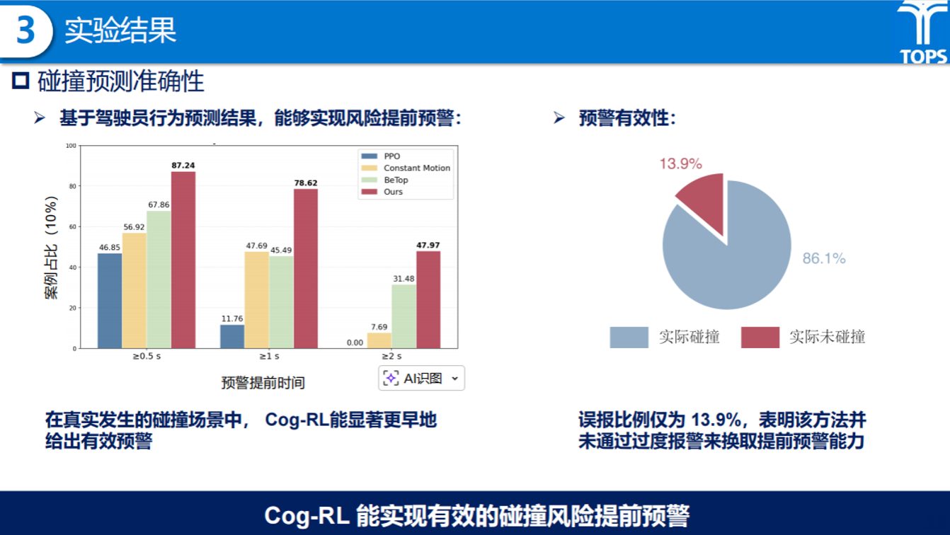 在实验结果方面,蒋溪彦同学在MetaDrive仿真平台构建了高速公路施工区等接管场景,并将Cog-RL模型与SOTA运动预测算法(BeTop)进行了对比。结果表明,Cog-RL在轨迹预测精度上优势明显,平均最小位移误差(minADE)降低至0.922,最终位移误差(minFDE)降低至2.430,且在准确预测的同时保持了更低的不确定性 。更重要的是,该模型能有效支持风险提前预警,在实验中实现了AEB触发时间平均提早30.7%,使得碰撞规避成功率提升了38.5%,有效填补了接管安全优化的“真空期”。