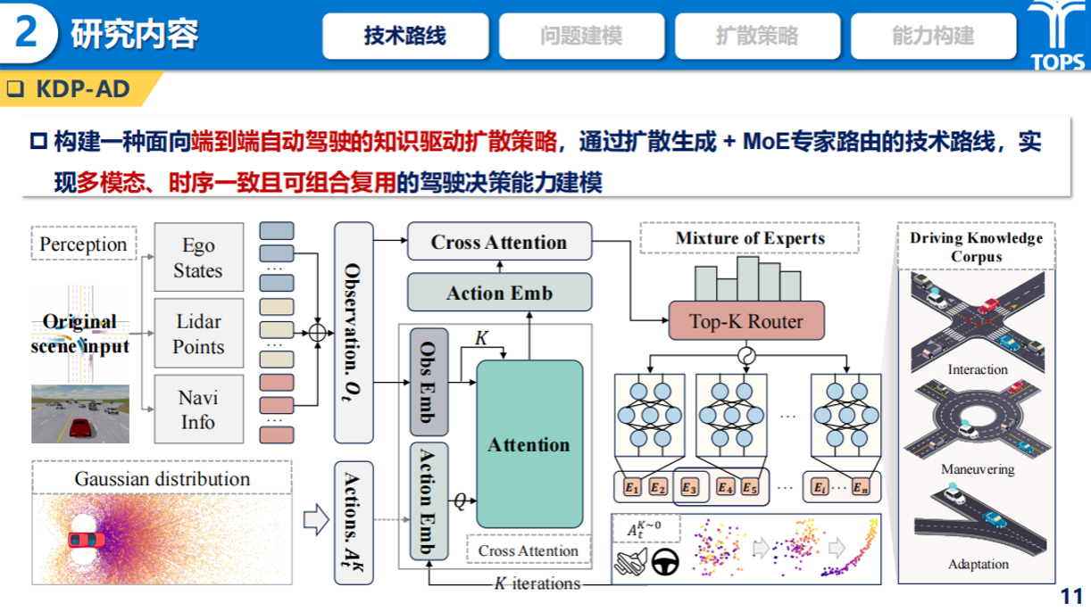 为此,徐成凯提出了一种基于专家路由的知识扩散型端到端自动驾驶模型KDP-AD,并设计了一种结合扩散生成策略与混合专家机制(MoE)的联合建模架构。