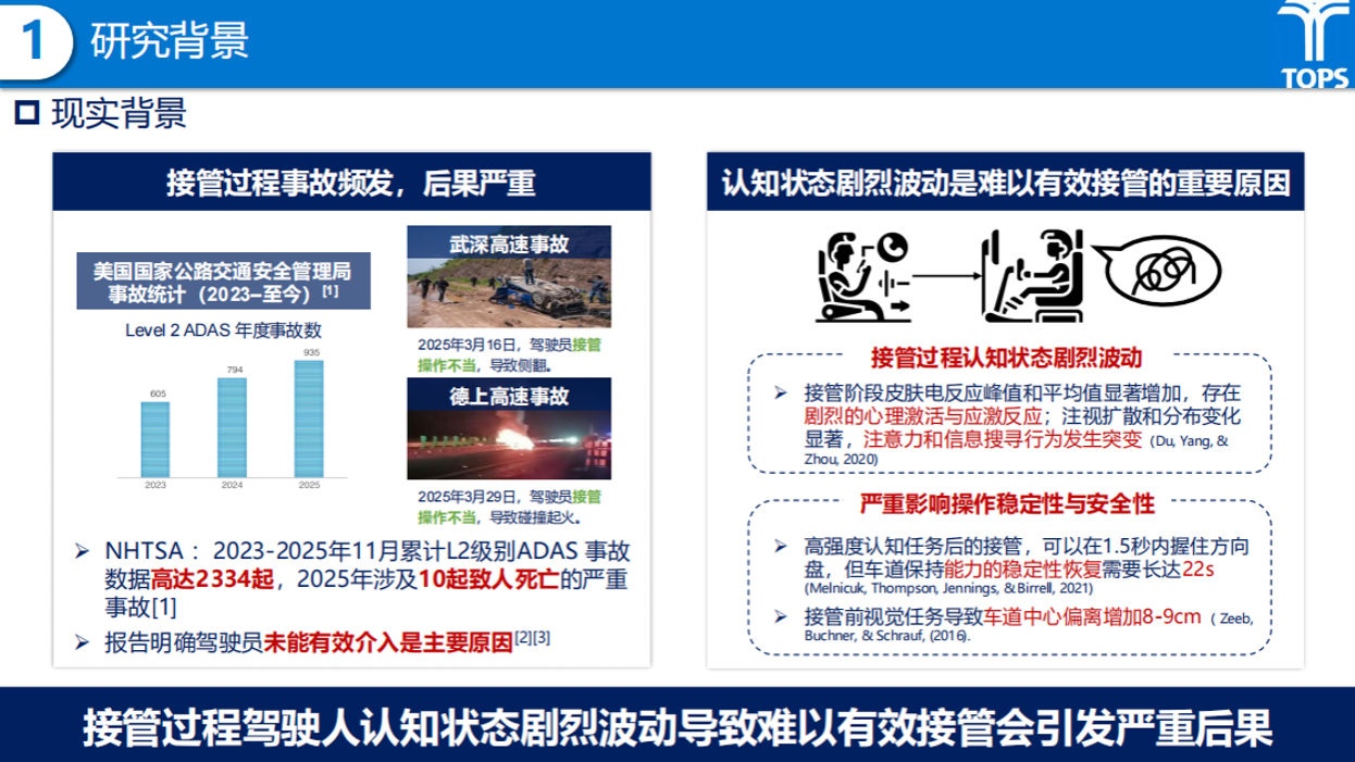 研究背景部分蒋溪彦同学指出,随着L2级自动驾驶系统的普及,接管过程中的事故频发且后果严重,NHTSA数据显示相关事故数量逐年攀升。这主要归因于接管过程中驾驶人认知状态的剧烈波动(如应激反应、注意力转移),导致操作稳定性下降。然而,现有的轨迹预测方法大多基于“群体行为一致”或“个体行为时不变”的假设,难以刻画认知状态波动导致的动态行为分布,导致在系统退出(TOR)与主动安全触发(AEB)之间存在显著的“安全优化真空期”。如何准确辨识驾驶人潜在风险行为并提前触发主动安全系统,成为提升接管安全性的关键。