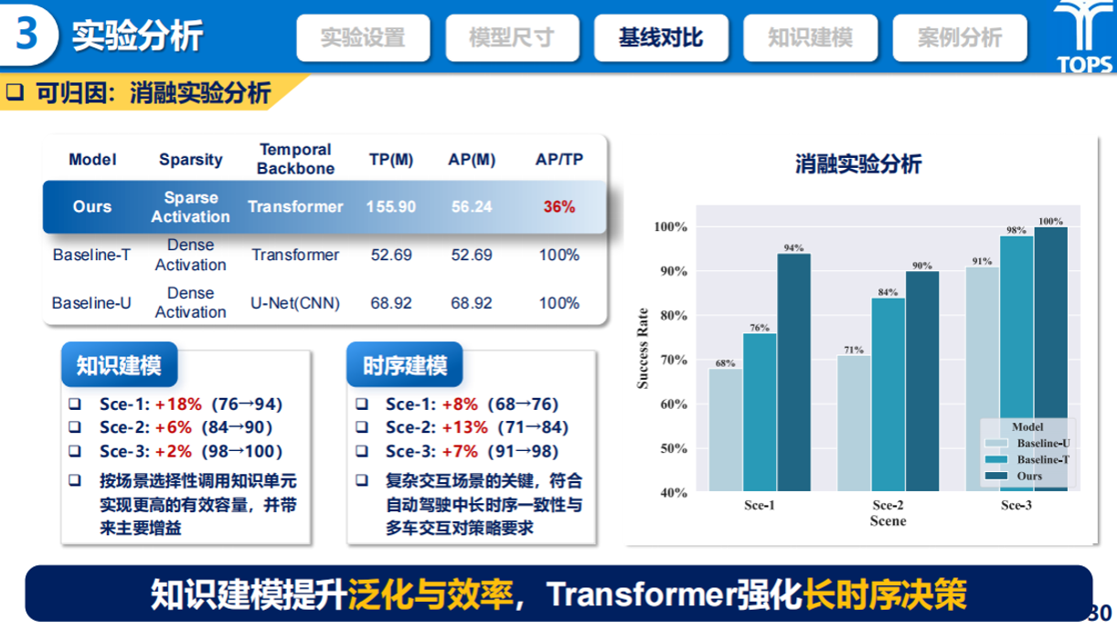 在实验结果方面,徐成凯同学构建了包含匝道并入、无信号交叉口及环岛通行等多类复杂交互场景的测试环境,并对比了强化学习(PPO-Lag)与模仿学习(IBC、RPID)等多种先进基线算法 。结果表明,所提出的KDP-AD模型在所有测试场景中均取得了最高的任务成功率与最低的碰撞率,综合表现显著优于现有算法。特别是在长时序的复杂交互过程中,模型展现出了优异的稳定性与泛化能力。可视化分析进一步证实,专家路由机制能够随场景演变稀疏地激活特定知识单元,不仅大幅提升了模型的有效容量,还赋予了端到端系统良好的可解释性。