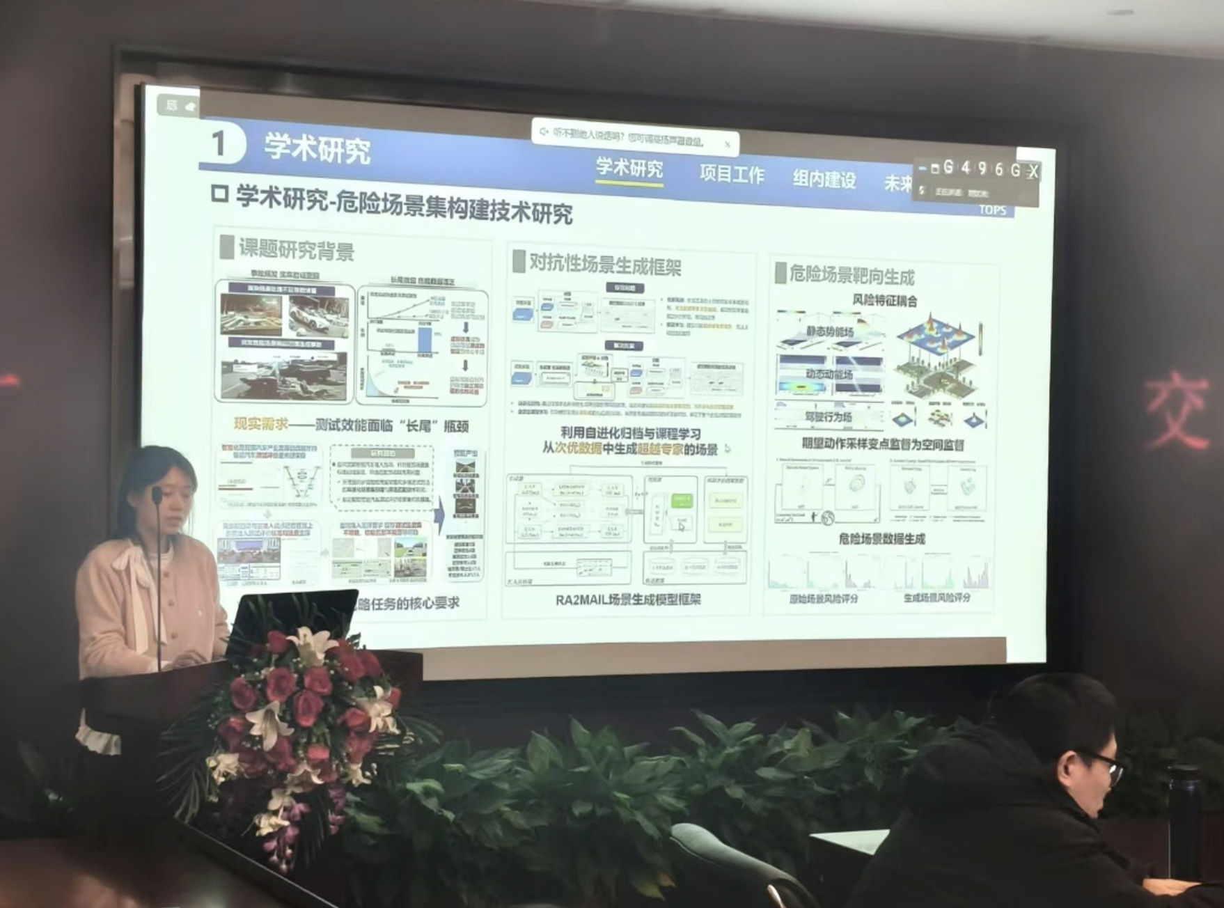 付如依与大家分享了危险场景集构建技术研究以及面向自动驾驶测试的多车交互建模中社会性作用的研究,项目上参与海康危险场景数据集构建,日常工作上主管会议预约事宜。孙剑老师建议提升研究效率,统筹规划好时间。