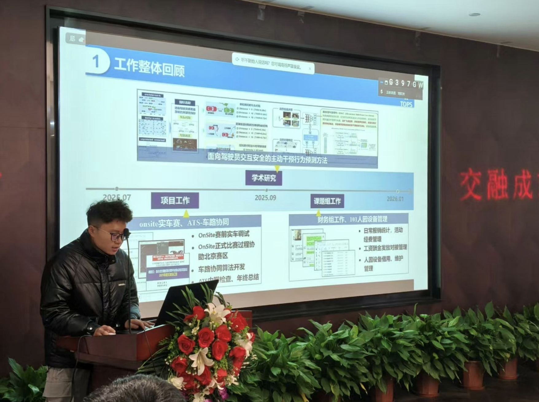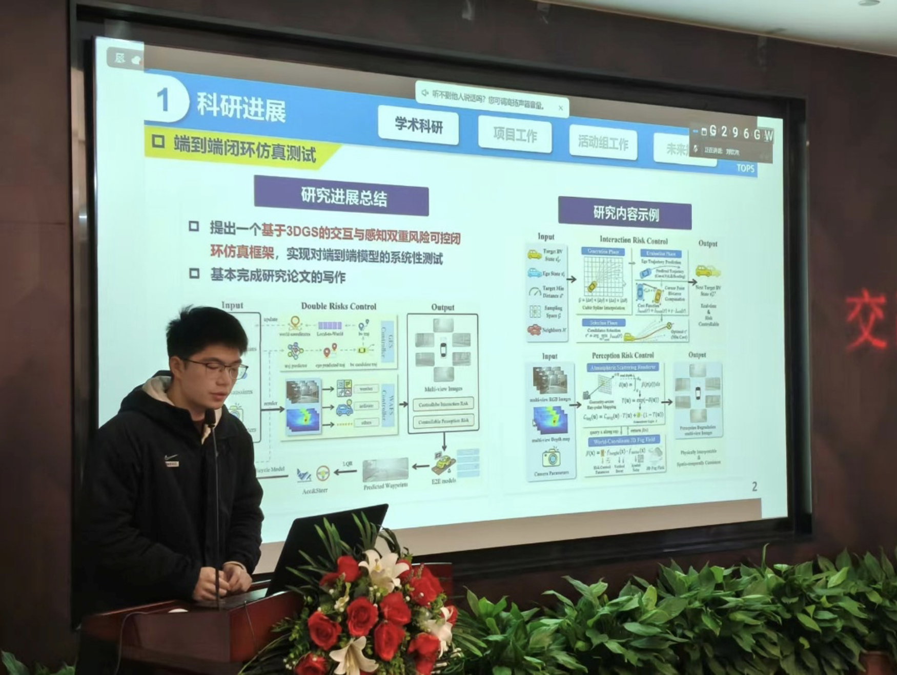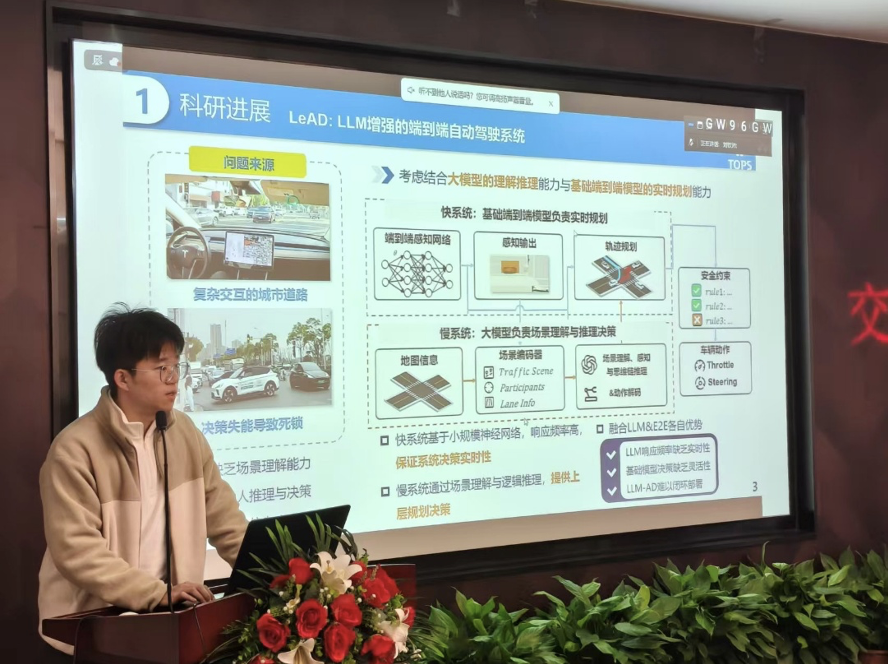 张宇航向大家介绍了他研究的LeAD: LLM增强的端到端自动驾驶系统,系统在遭遇偶发边缘场景时可以进行有效决策,并将研究成果转化为一篇ITSC论文。项目工作上,全程跟进百度实车从0到1的落地,支撑Onsite实车赛车辆交付,在北京调车付出了巨大努力。孙剑老师予以赞赏,其为实车赛付出心血令人十分动容。