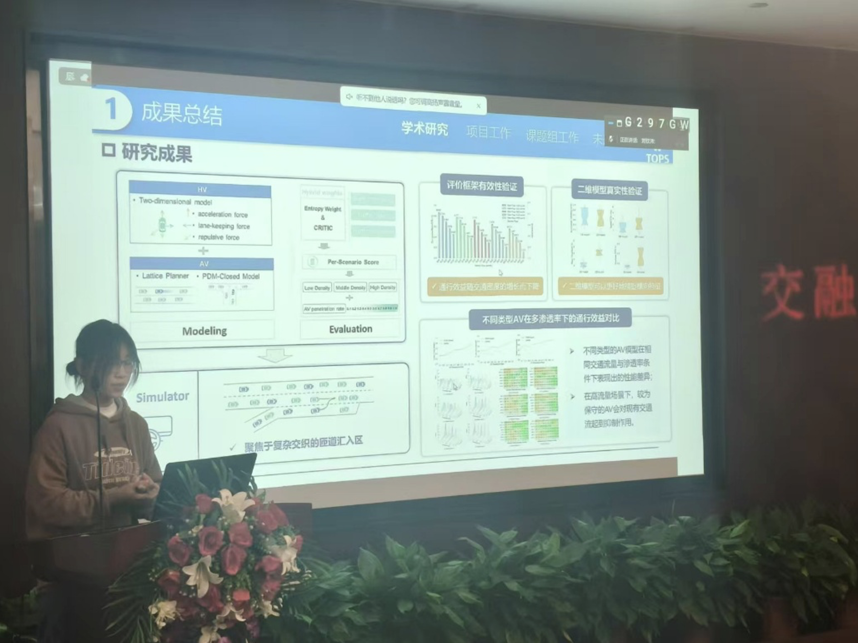 刘钦沛同学介绍了他在海康威视项目中负责的轨迹重构模块,研究聚焦于异质性、随机性宏观交通流模型的稳定性分析,担任活动组的会议相关工作。孙剑老师指出研究要落到实处,不能浮于表面,要加紧研究步伐,希望进入研究生的良性循环当中。