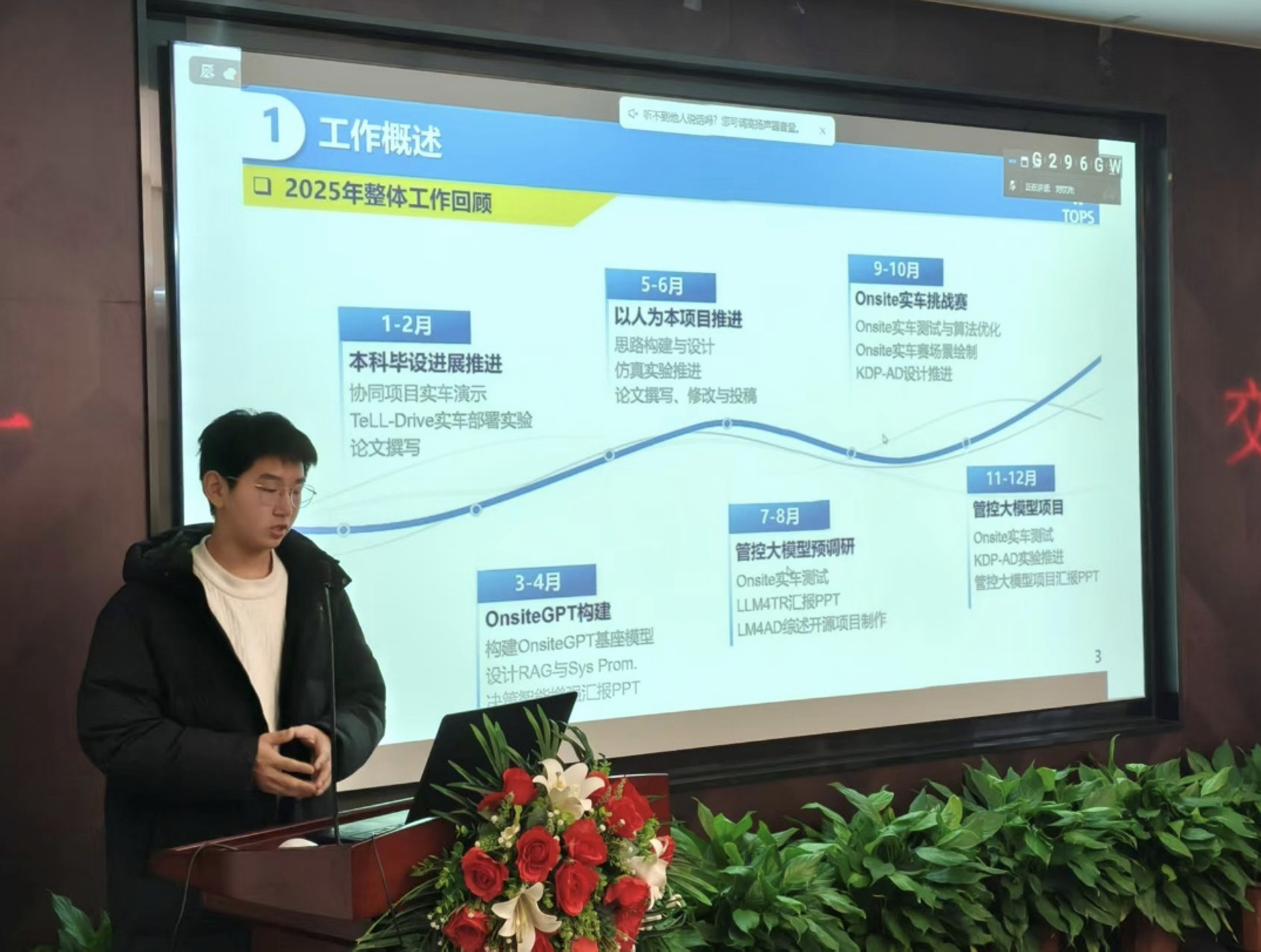 王吕洋介绍了基于LLM权责划分的端到端驾驶闭环对抗训练研究,并不断进行微调与验证。并且深度参与第三届Onsite线下赛的筹备工作,做好客服工作,提升服务水平。组内建设方面负责部分餐饮订购,并协助秋游与年会组织工作。孙剑老师指出组内不要内卷,别一窝蜂拥挤在一个方向研究,需要加强组内交流,互利共赢,共同进步。