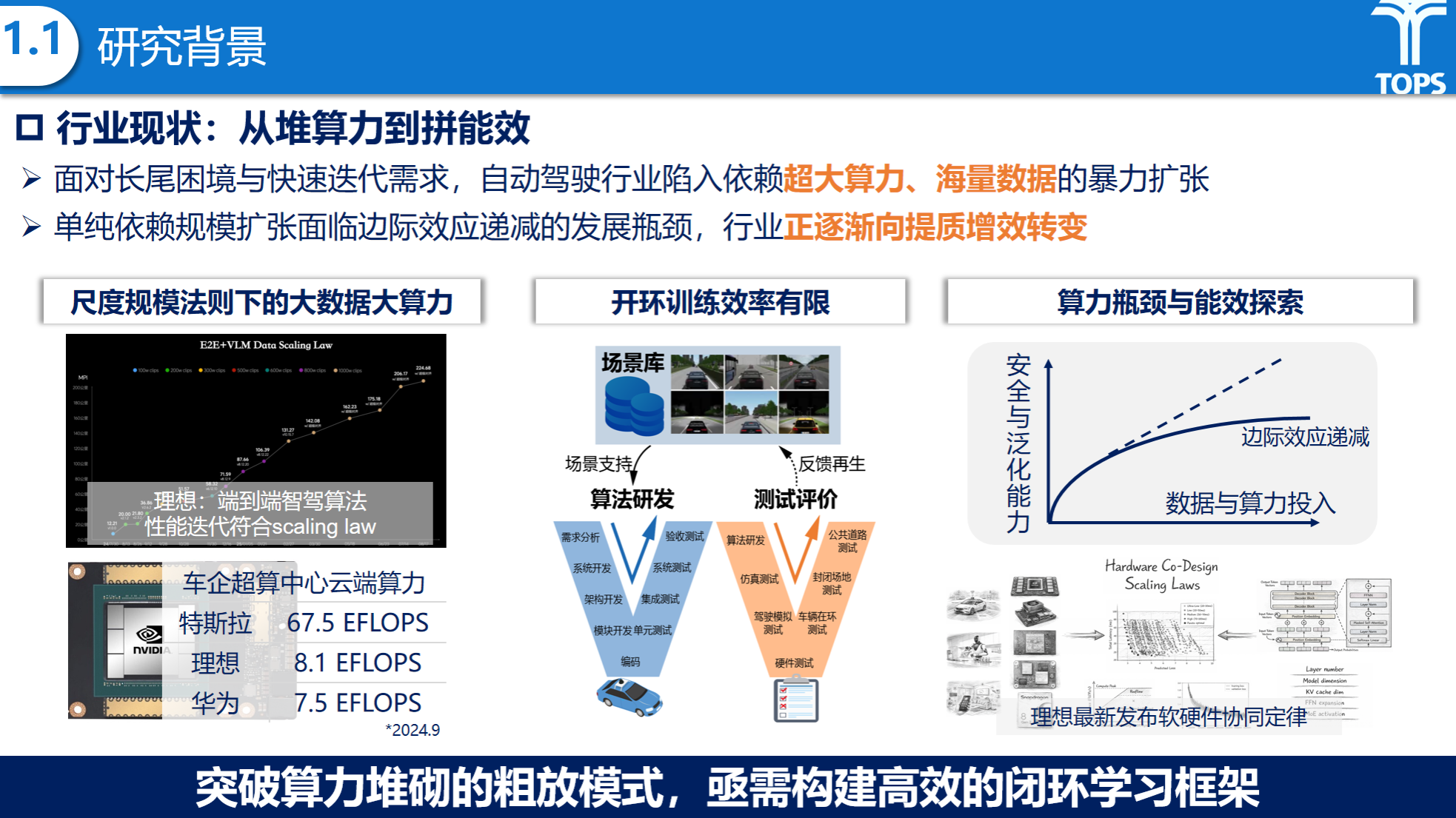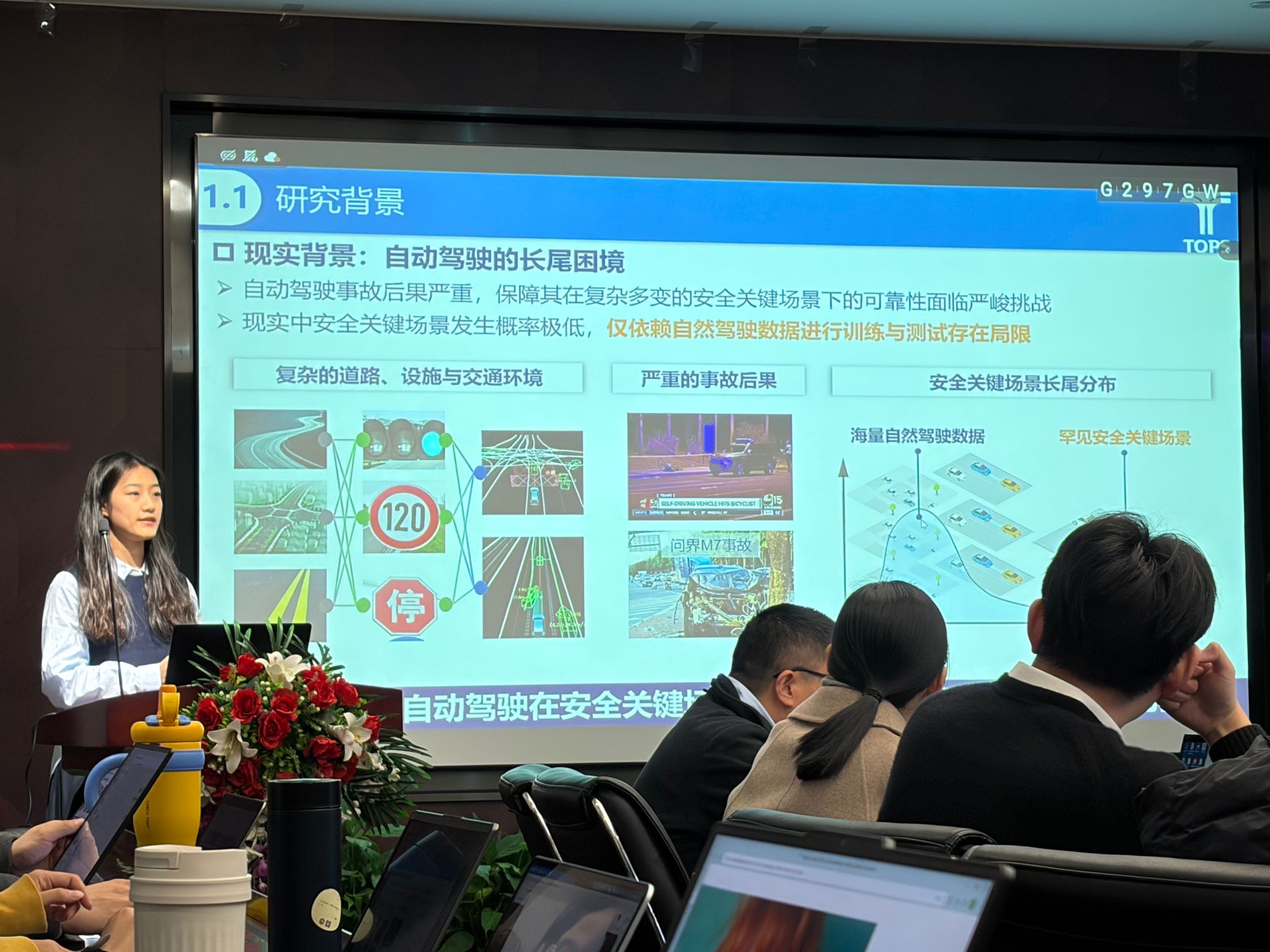 在研究背景方面,梅月雯同学指出,尽管当前自动驾驶技术在常规场景中已取得显著进展,但在安全关键的长尾场景下仍面临鲁棒性不足与安全性挑战。由于高风险场景稀缺,单纯依赖自然驾驶数据难以支撑模型有效训练。为应对这一问题,行业陷入了依赖超大算力和海量数据的暴力扩张模式,但受限于开环训练效率,该模式逐渐遭遇边际收益递减,亟需构建高效的闭环学习框架。