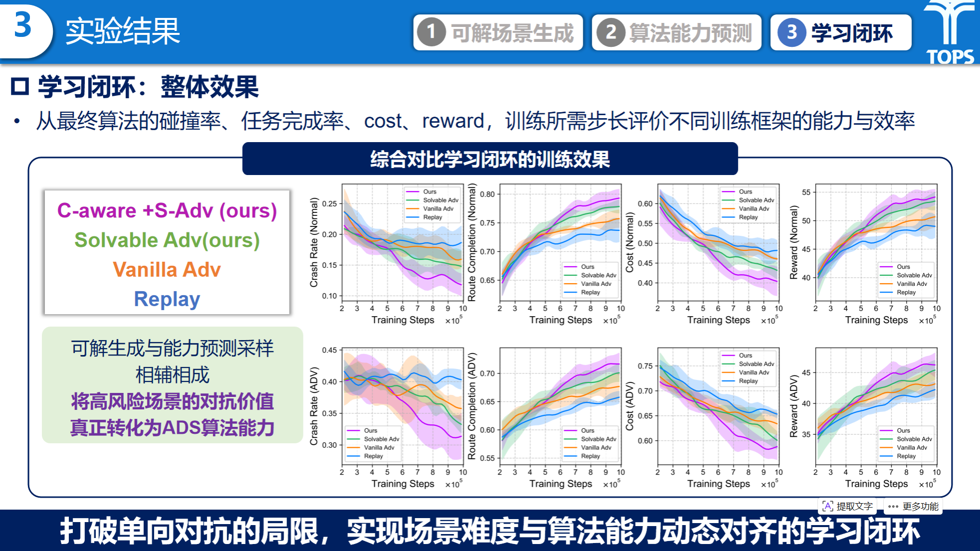 在闭环学习中,场景生成算法剔除不可解的超纲错题,进一步降低了算法碰撞率,提升了任务完成率;因材施教的动态课程采样,具有更快的学习速度,避免了在简单场景上的算力浪费;整体训练效果上,可解生成与能力预测采样相辅相成实现场景难度与算法能力动态对齐的学习闭环。