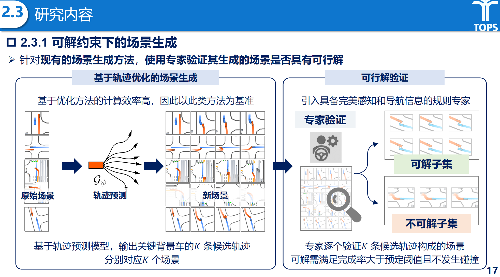 在研究内容方面,梅月雯同学围绕学习闭环构建提出了系统化方法框架。首先,在对抗场景生成方面,引入可解性约束机制,通过专家验证与直接偏好优化(DPO)方法,对生成场景进行筛选与引导,使模型在保持对抗性的同时,避免产生不可解的极端场景,从而保证训练信号的有效性。